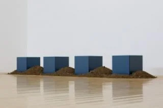 The exhibition also made an interesting use of mirrors, especially in that they're used in decidedly different ways in each piece. In the work below, Miller makes a reference to Robert Smithson's well-known non-sites, but here the mirrors are turned inward, endlessly reflecting, a model of solipsism, or perhaps merely make a gesture toward what's unthinkable. There's also something exceptionally controlled about this treatment of land art; it's very geometric. And the mounds of dirt are equally distributed along a gentle curve.